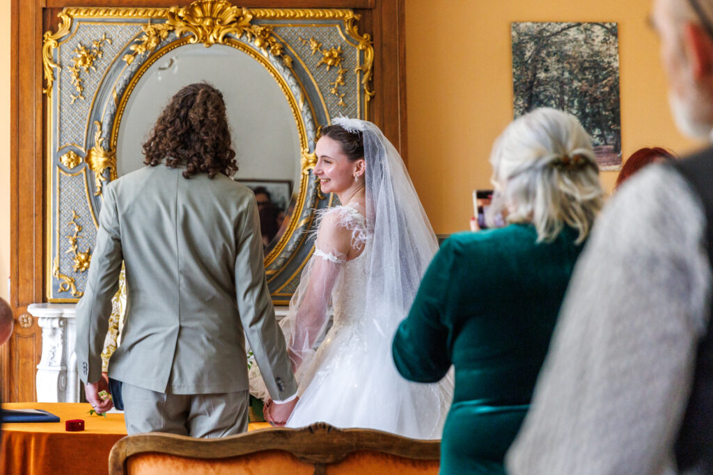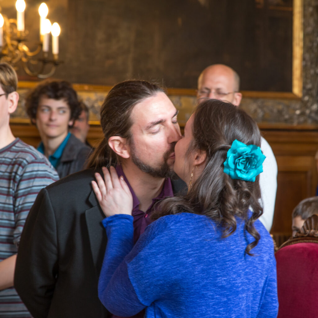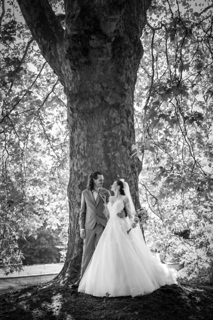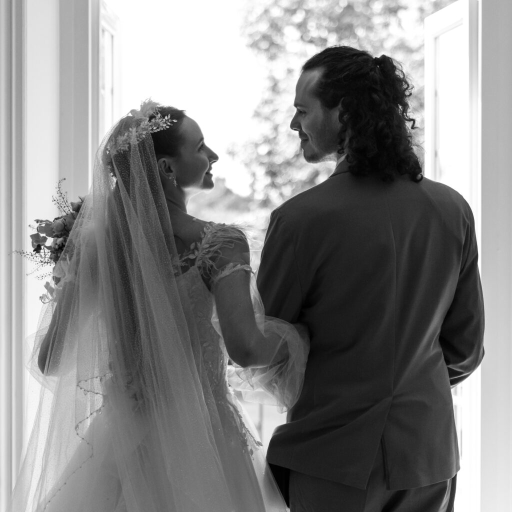 Techniquement : je m’équipe de deux boitiers professionnels le jour J (de marque Canon si vous voulez tout savoir). Sur chacun, les photos sont enregistrées simultanément sur 2 cartes mémoires différentes pour plus de sécurité. Je dispose de plusieurs objectifs professionnels me permettant de faire des plans larges comme des plans rapprochés. J’utilise également du matériel d’éclairage type studio mobile sur demande, afin de travailler en soirée ou de proposer un espace fixe où les invités peuvent poser au gré de leurs envies.