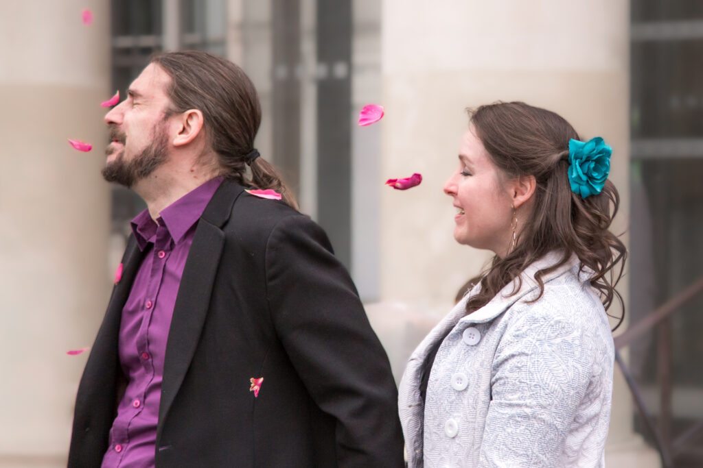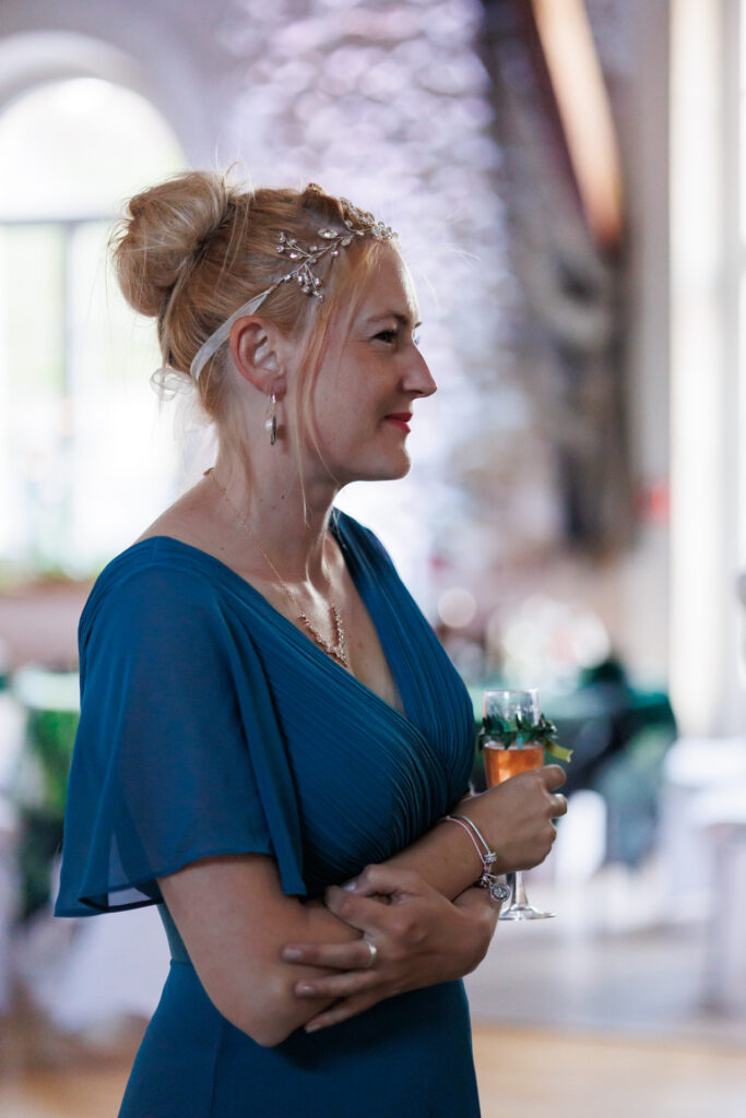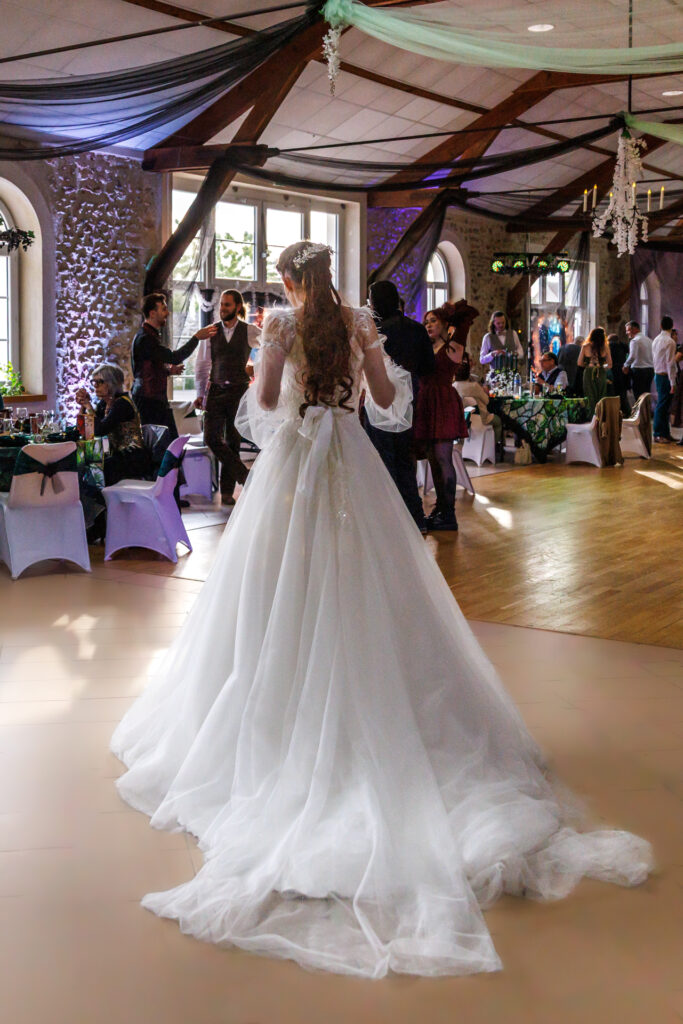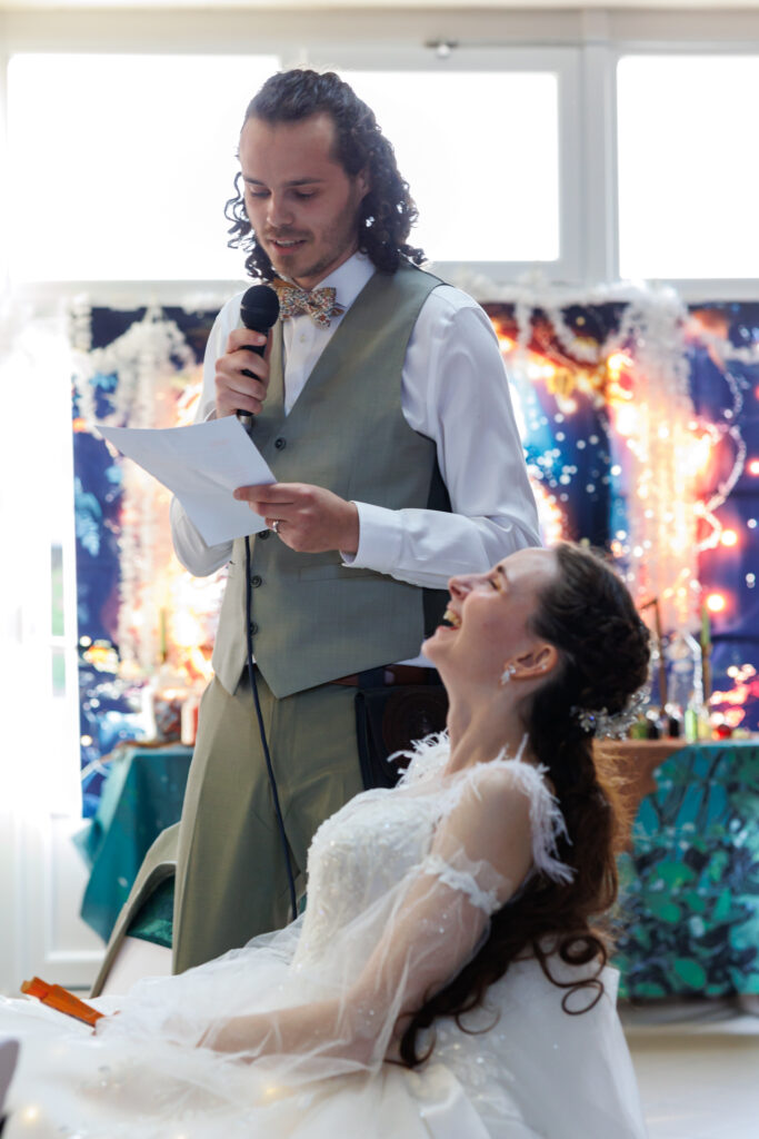 Techniquement : je m’équipe de deux boitiers professionnels le jour J (de marque Canon si vous voulez tout savoir). Sur chacun, les photos sont enregistrées simultanément sur 2 cartes mémoires différentes pour plus de sécurité. Je dispose de plusieurs objectifs professionnels me permettant de faire des plans larges comme des plans rapprochés. J’utilise également du matériel d’éclairage type studio mobile sur demande, afin de travailler en soirée ou de proposer un espace fixe où les invités peuvent poser au gré de leurs envies.
